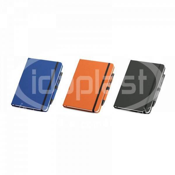 Kit de caderno A5 e esferográfica em c. sintético com 80 folhas não pautadas, fita separadora e elástico. Esferográfica de escrita azul. Fornecido com caixa presente em PP com elástico. Esferográfica: ø10 x 137 mm | Bloco: 140 x 210 mm | Caixa: 155 x 214 x 13 mm