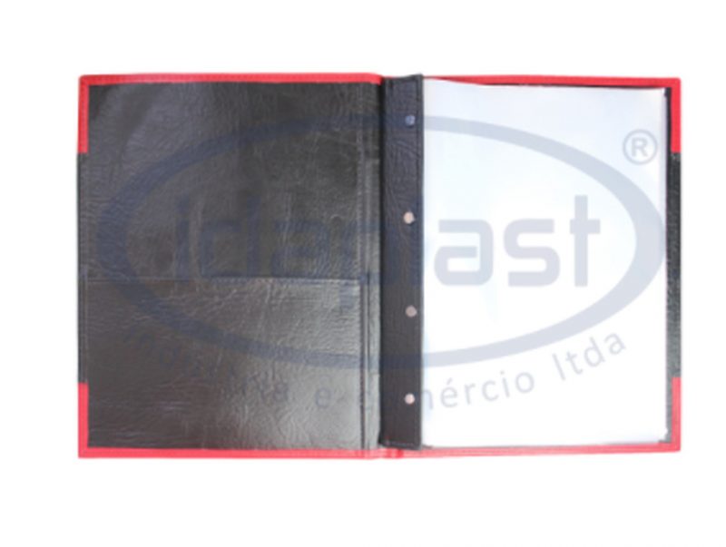 Confeccionada em poliéster colorido ou courino sintético preto, marrom ou azul marinho, a pasta mede 32 x 25 x 1,5 cm, o modelo conta com 2 semi bolsos e suporte para bloco de anotações, porta canetas e porta cartões. A personalização da pasta pode ser feita em silk screen em até 4 cores de baixo relevo. O pedido mínimo é de 50 unidades.