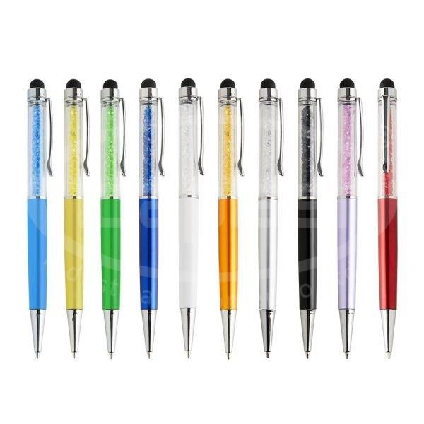 Caneta plástica com touch screen e detalhes em mini miçangas cristal (efeito glitter). A caneta glitter brilho aciona por rotação e carga esferográfica azul 1mm.