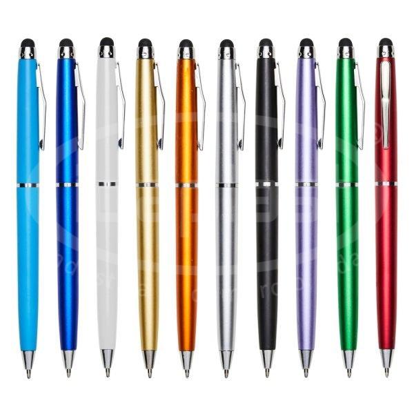 Caneta plástica touch screen com acionamento por rotação e carga esferográfica azul 1mm.