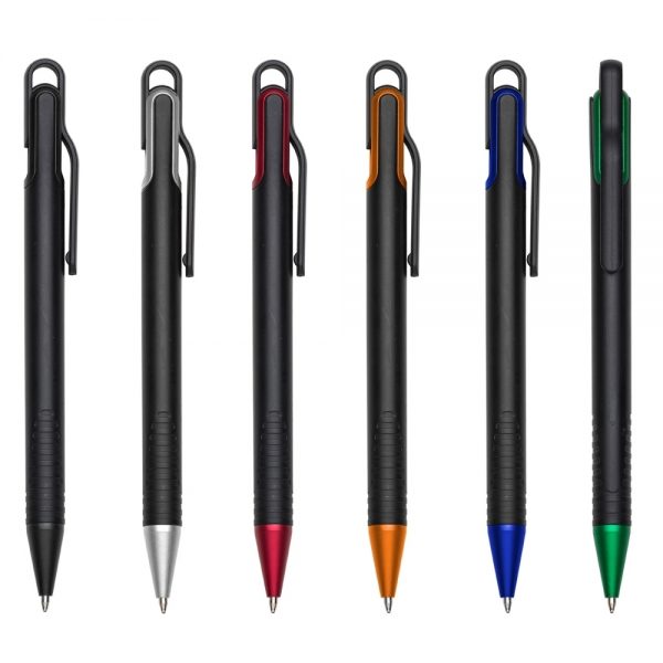 Caneta plástica inteira preta com laterais do acionador colorido. Detalhes em relevo na parte inferior. Aciona por clique.