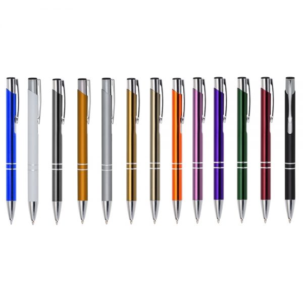 Caneta metal inteira colorida com detalhes prata. Clip metal com a ponta do acionador preto, parte inferior com dois anéis prata. Aciona por clique.