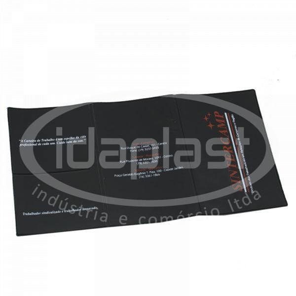 A Idaplast é fabrica capa para carteira de trabalho. Modelo de três repartições, sendo duas delas bolsos comuns para inserção do documento. Na terceira repartição, há dois compartimentos para encaixe de outros documentos/informativos da empresa.