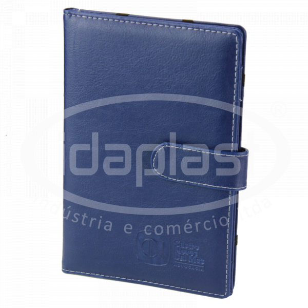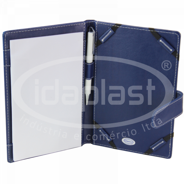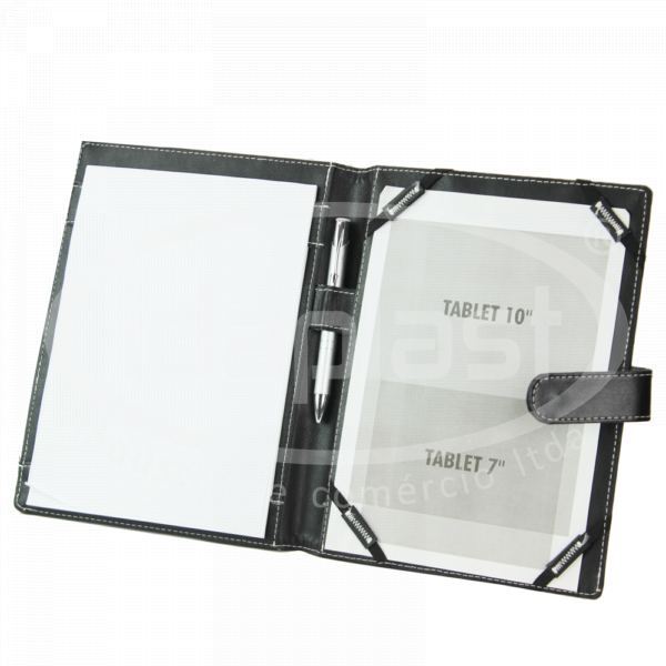 Capa para tablet personalizada confeccionada em couro sintético, com acabamento em costura. Interior com suportes para papéis, porta caneta e prendedores laterais em elástico. Fechamento em lingueta com botão imã. Fabricamos sob medida!