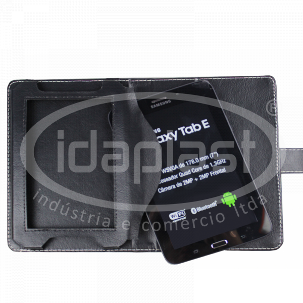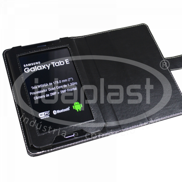 Capa para tablet personalizada com suporte especial e fechamento em lingueta. Confeccionada em couro sintético ou poliéster. Acabamento em costura. Design sob medida para seu modelo de aparelho