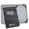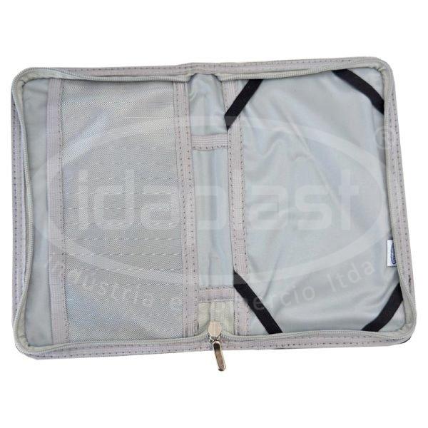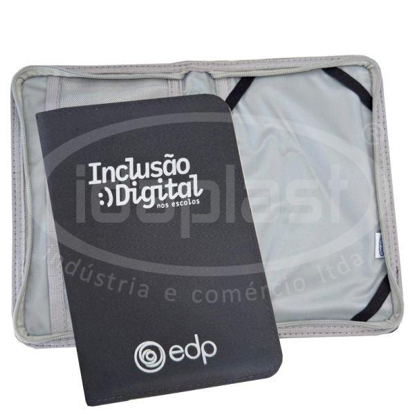 Porta tablet em poliéster, com fechamento em zíper. Interior com forro cor a definir, bolsos e elásticos para alocar o aparelho.