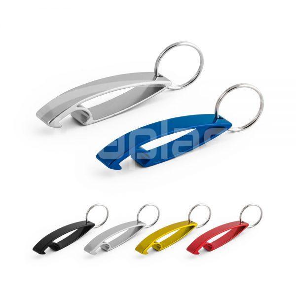 Chaveiro personalizado em alumínio com abridor de garrafas, ideal para brinde.