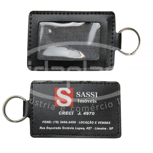Chaveiro imobiliário em couro sintético. Com acabamento em costura. Argola niquelada.