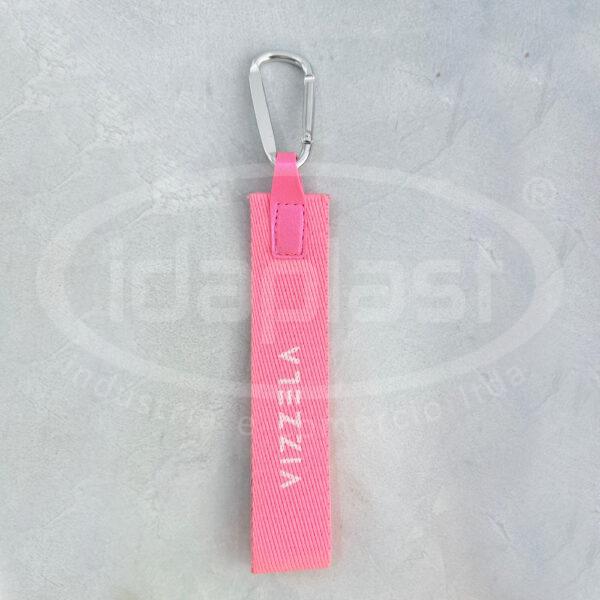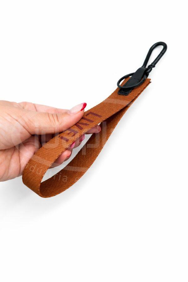 Chaveiro especial em tecido canelado com mosquetão e detalhe em courino.