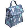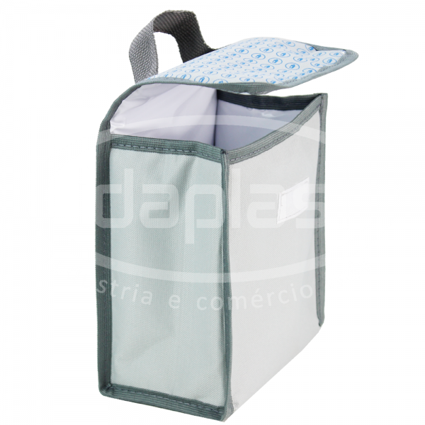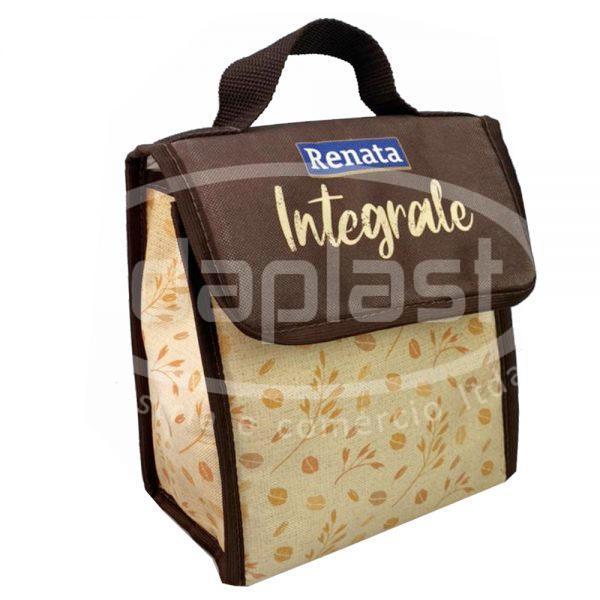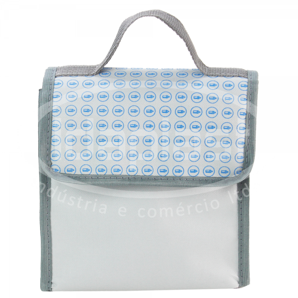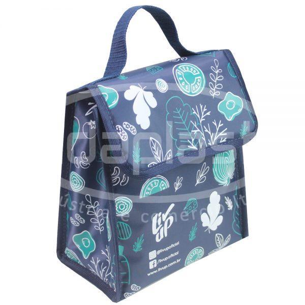 Bolsa térmica personalizada confeccionada em nylon. Conta com alça de mão e aba com velcro para fechamento.