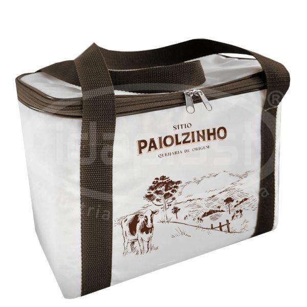 Bolsa térmica confeccionada em nylon (comum ou semi impermeável) ou em PVC brilho. Interior térmico em PVC grosso, com acabamento em costura (não é impermeável). Com alças de mão. Monte a sua com seu consultor!