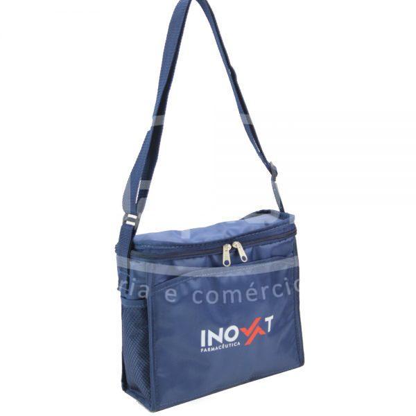 Bolsa térmica personalizada em nylon, com bolsos laterais em tela simples e bolso frontal com velcro. Conta com alça tiracolo fixa com regulador de medidas.