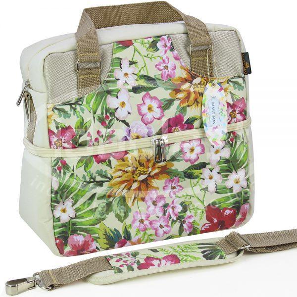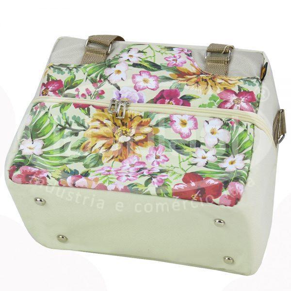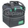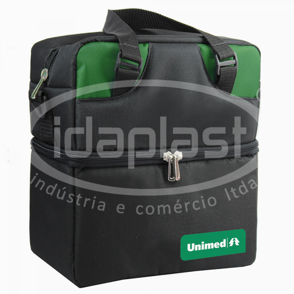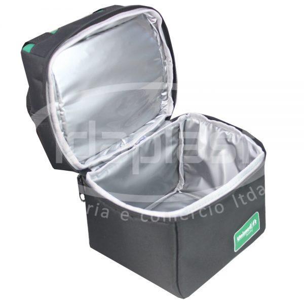 Bolsa térmica personalizada confeccionada em nylon. Com 2 divisórias de fechamento em zíper (cursores simples ou especiais a definir). Com alça de mão e opcional de alça tiracolo com ombreira almofadada. Cravos plásticos ou niquelados e fundo rígido como opcionais de fabricação.
