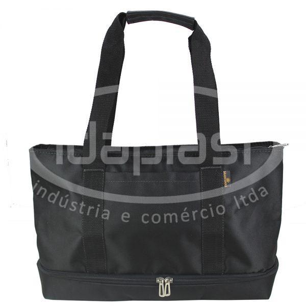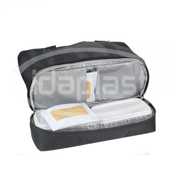 Sacola térmica ideal para academia e transporte de alimentos (marmita) e roupas. Com compartimento térmico inferior e superior. Com porta squeeze.