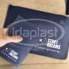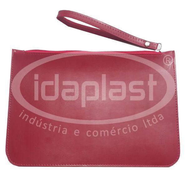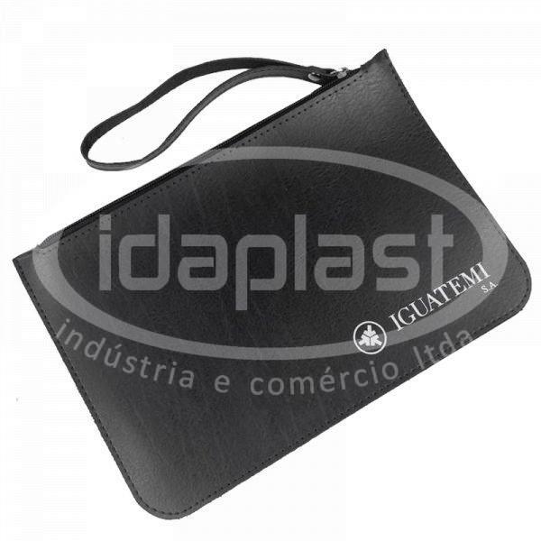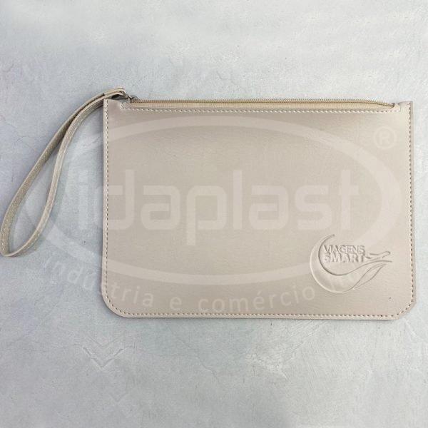 Porta voucher em courino sintético personalizado, com alça de mão e zíper. Cursor simples ou especial.