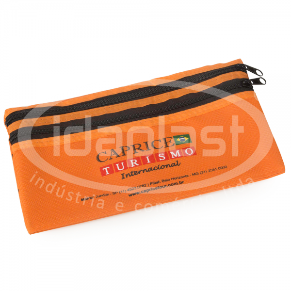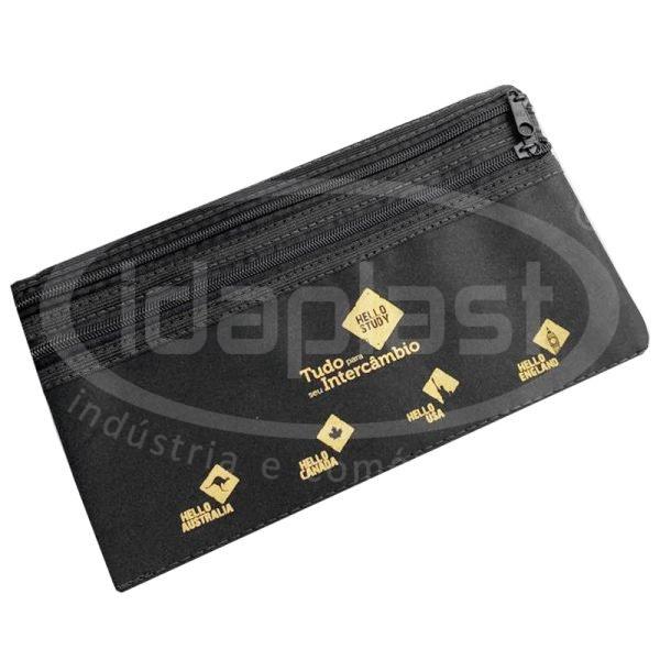 Porta voucher para passagem ideal para viagem. Brinde confeccionado em tecido com detalhes em couro sintético. Com 2 compartimentos em zíper.