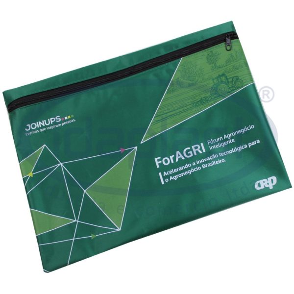 Envelope confeccionado em poliéster personalizado, com zíper. Diversas cores disponíveis. Conta com acabamento em costura.