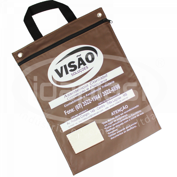 Malotes personalizados transporte de documentos. Confeccionado preferencialmente em nylon ou sintético Bagum. Com alça manual. Com detalhe em ilhós (e ou 2), visor frontal e zíper. Pode contar com viés nas laterais e no visor.