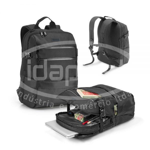 Mochila para notebook em 840D jacquard com dois compartimentos forrados. O compartimento posterior tem duas divisórias almofadadas para notebook até 15.6” e tablet 10.5”. O compartimento frontal tem diversos bolsos interiores. Mochila com 3 bolsos frontais e 2 bolsos laterais, parte posterior almofadada, com sistema de apoio acolchoado para as costas e alças almofadadas. Placa metálica removível com imã, para fácil gravação. Placa: 50 x 20 mm