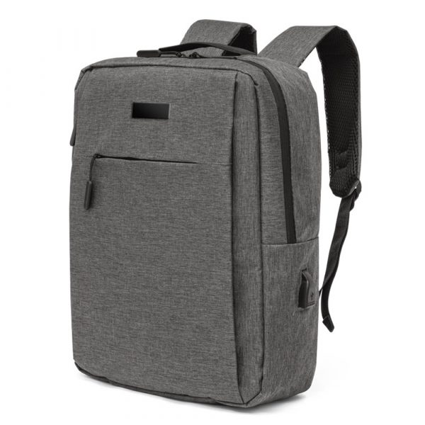 Mochila para notebook em 300D com placa de personalização. Tem 1 compartimento principal com bolso forrado para notebook até 15,6″ e diversos bolsos interiores. Contém ainda bolso frontal, lateral e entrada USB. Parte posterior e alças são almofadadas. 300 x 420 x 120 mm