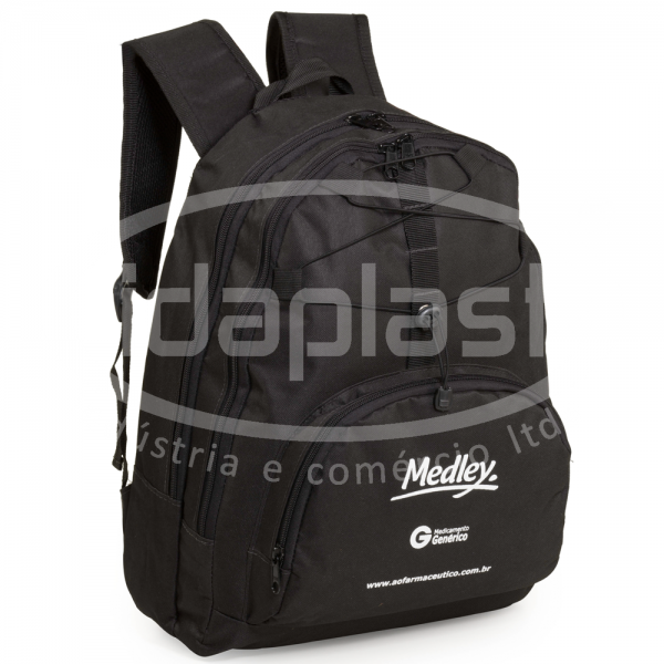 Mochila personalizada confeccionada em nylon. Com detalhes em elástico. Opcional de porta notebook.