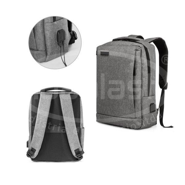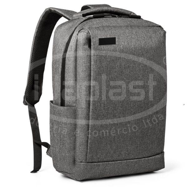 Mochila para notebook em 300D com placa de personalização. Tem 1 compartimento principal com 2 bolsos forrados para notebook até 15,6″ e tablet 10,5″ e diversos bolsos interiores. Incluso banda para transporte em trolley, bolso frontal, bolso lateral e entradas USB e Jack 3,5 mm. Parte posterior e alças são almofadadas. Medidas: 320 x 410 x 120 mm