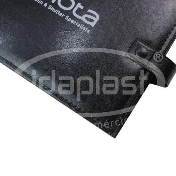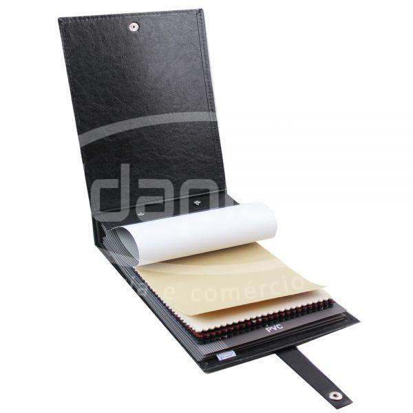 Capa para mostruário de tecidos em couro sintético (diversos tipos, texturas e cores para escolha!). Conta com alça rígida preta e interior com dorso embutido. Parafusos niquelados e lingueta com botão de pressão para fechamento. Costurada.