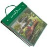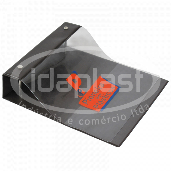 Capa para mostruário de tecido com frente plástica transparente. Em PVC ou sintético. Contracapa rígida em PVC. Acabamento em solda. Cliente pode optar por 2, 3 ou 4 parafusos (a depender da medida da pasta). Com alça de mão em cordão simples ou cordão especial roliço.