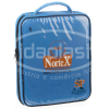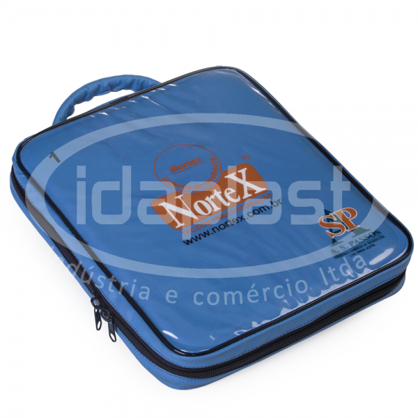 Capa personalizada para amostras de tecidos. Com fechamento em zíper e alça de mão. Confeccionada em couro sintético.