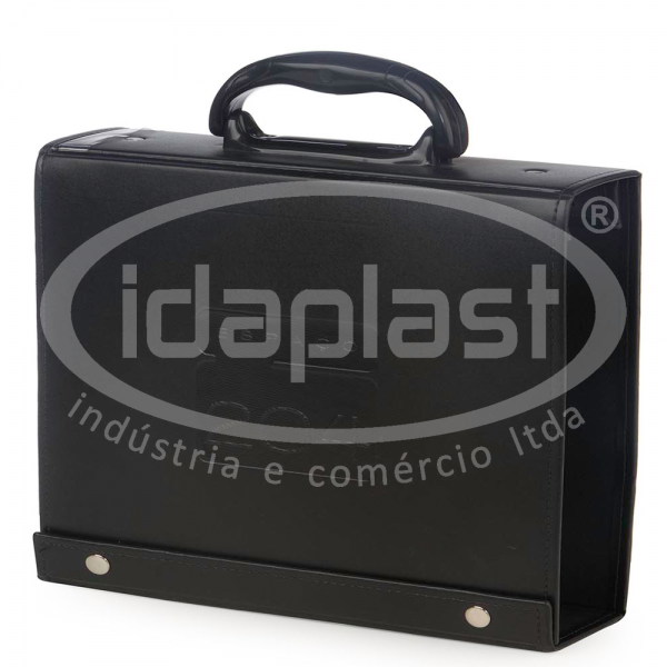 Capa para mostruário de tecido em couro sintético. Com alça tipo maleta e fechamento em botão de pressão. Costurada.