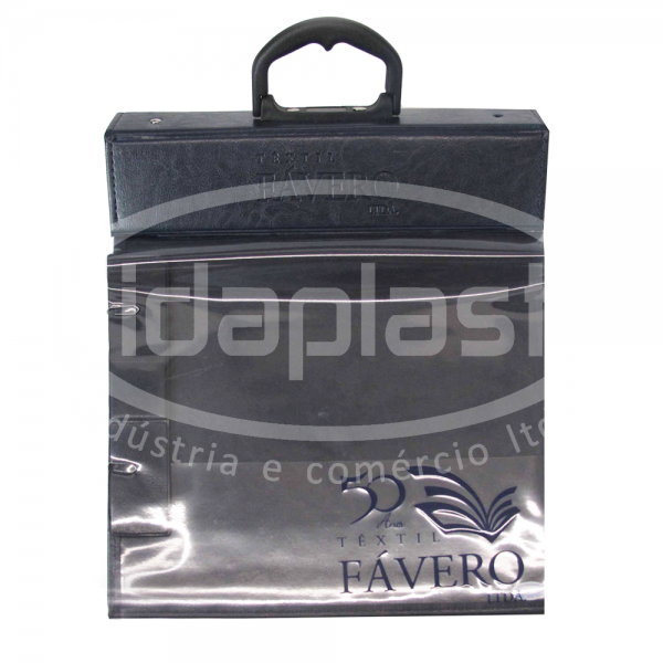 Pasta com capa plástica transparente para mostruário de tecidos. Conta com alça tipo maleta.