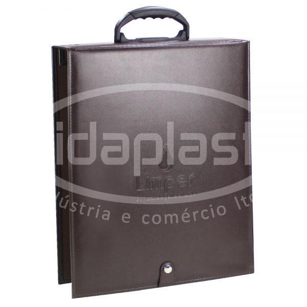 Pasta mostruário de tecido em couro sintético. Com alça de mão tipo maleta. Dorso embutido e lingueta para fechamento com botão de pressão.