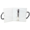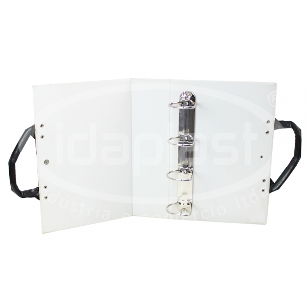 Pasta mostruário tipo fichário. Conta com argolas internas, acabamento em solda e alça em couro sintético. Fechamento em lingueta de PVC com botão de pressão.