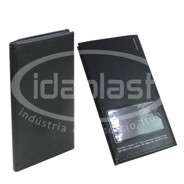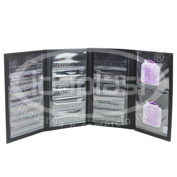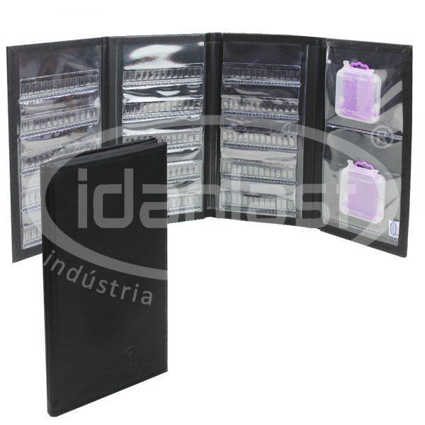 Pasta mostruário para brocas de odontologia. Bolsos internos em PVC transparente com aba, feitos sob medida para cada cliente. Acabamento externo em costura. Com visor para inserção de cartão de identificação.