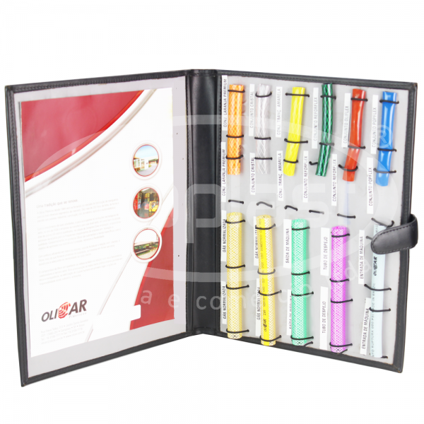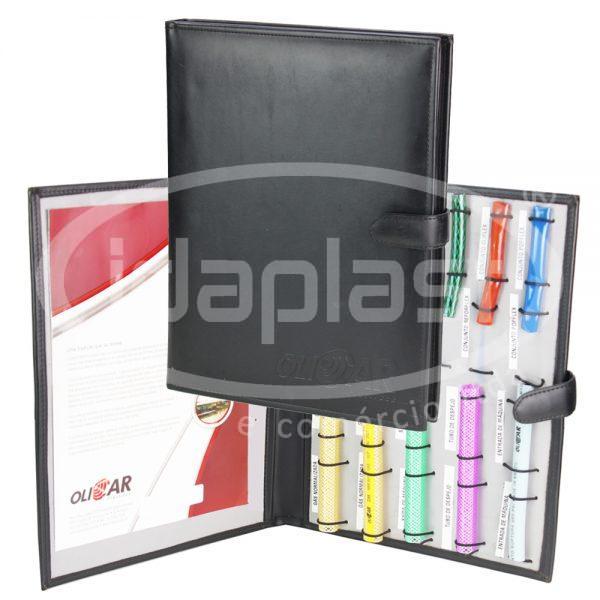 Pasta mostruário de mangueiras, totalmente personalizada para seu projeto! Defina cor de couro sintético, medidas, quantidade de elásticos e muito mais!