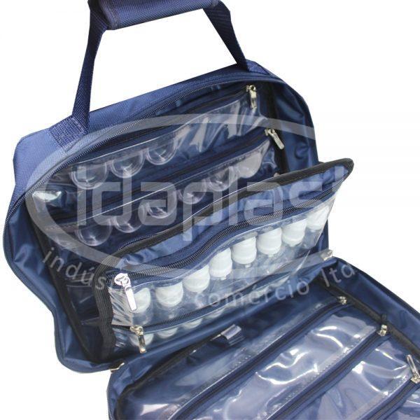 Bolsa mostruário para frascos. Conta com bolsos internos para potes e frascos de cosméticos ou outras amostras. Confeccionada em tecido ou couro sintético (diversas cores e texturas para escolha!). Confeccionamos o seu projeto totalmente sob medida.