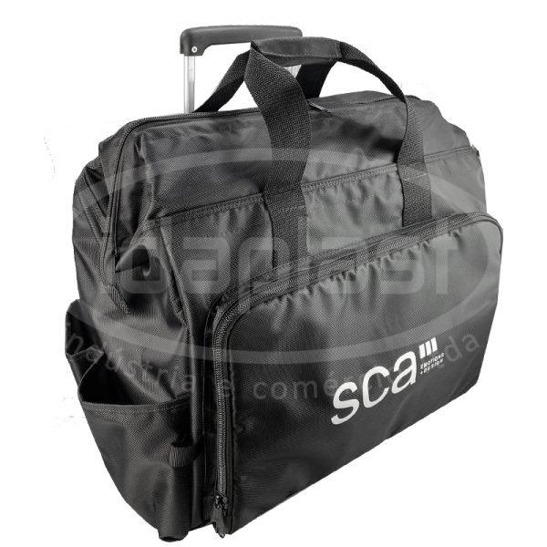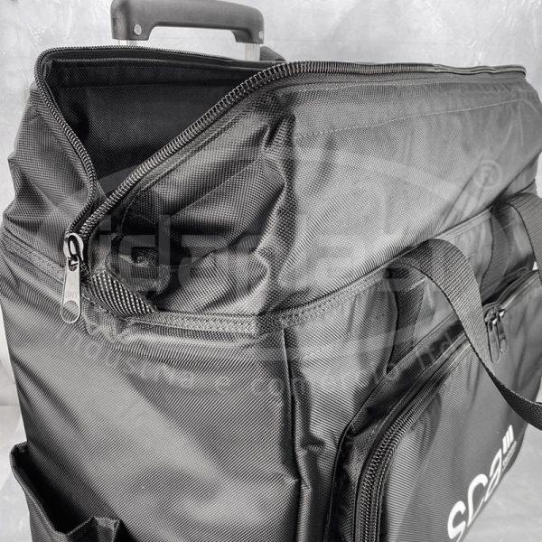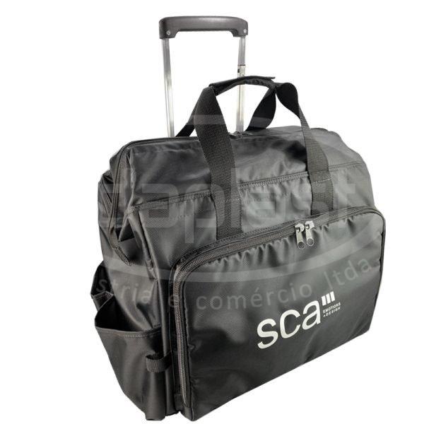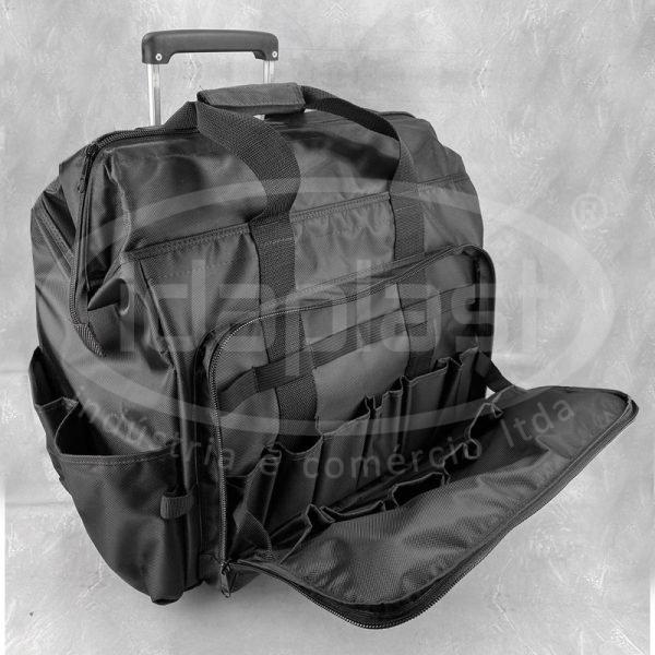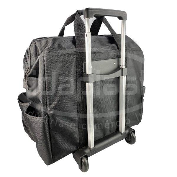 Bolsa para ferramentas personalizada e sob medida. Conta com carrinho e rodas, interior com bolsos e fechamento do bocal em ferro (para manter abertura da peça enquanto há manuseio das ferramentas).