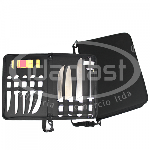 Embalagem personalizado tipo mostruário facas. Confeccionado em nylon ou couro sintético. Montagem dos elásticos internos sob medida para cada cliente.