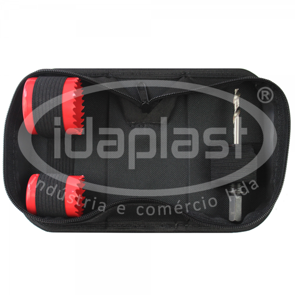 Estojo personalizado tipo embalagem para ferramentas, como serra copo. Interior com elásticos montados de acordo com necessidade do cliente.