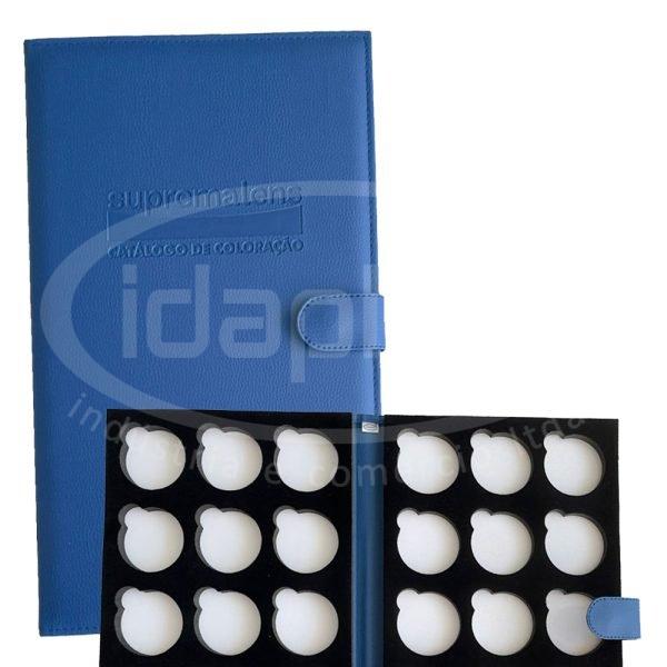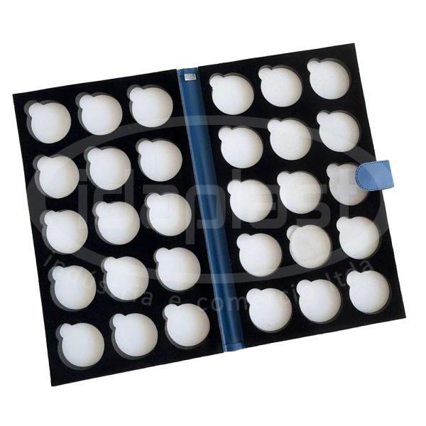 Pasta mostruários para exposição de amostras de lentes para óculos. Confeccionada em courino ou poliéster, sob medida.