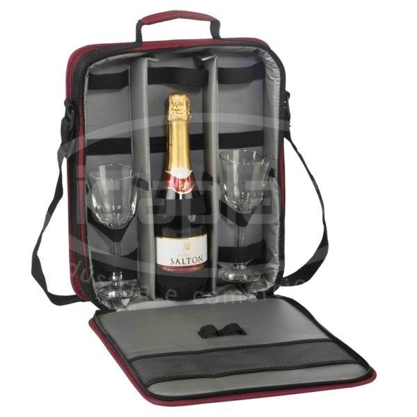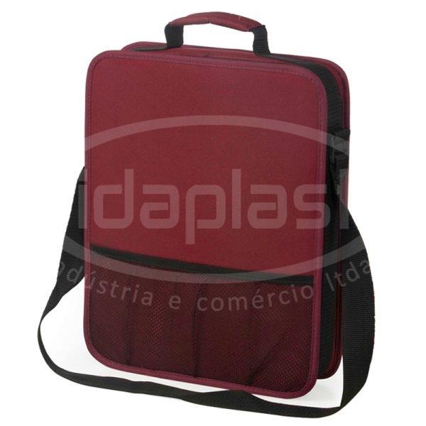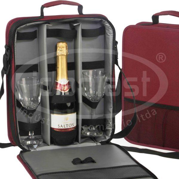 Porta vinhos personalizado, com estrutura rígida e reforçada. Com alça de mão e alça tiracolo. Almofadada, com repartições removíveis e elásticos. Fechamento em zíper. Confeccionada em courino sintético ou poliéster.