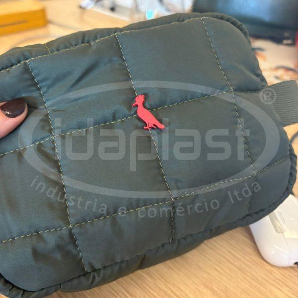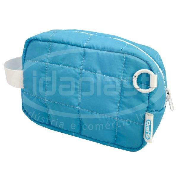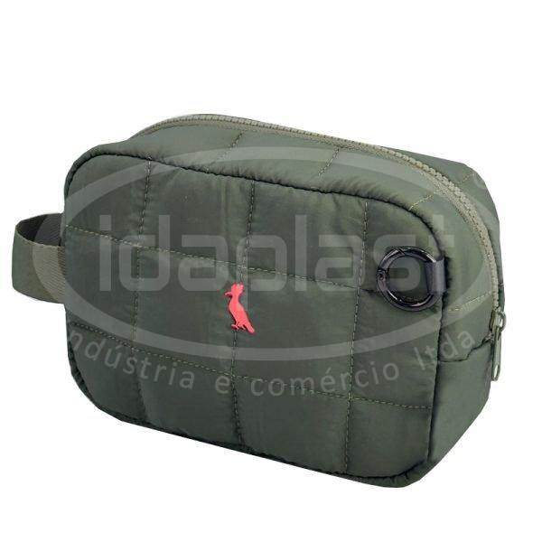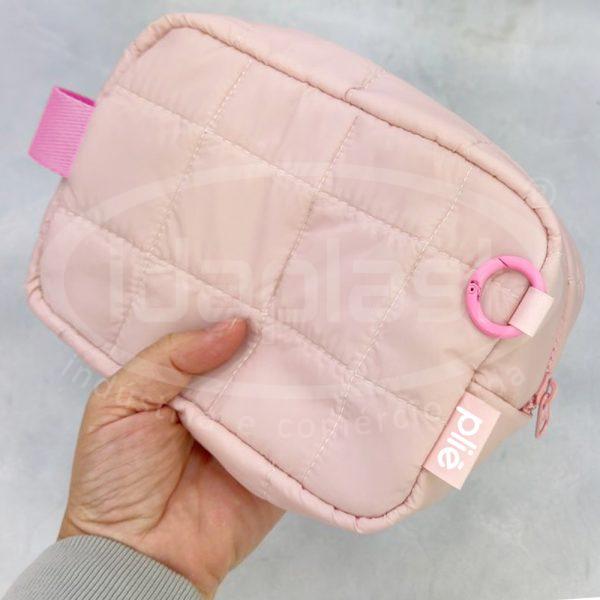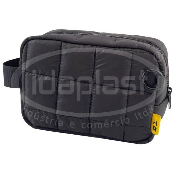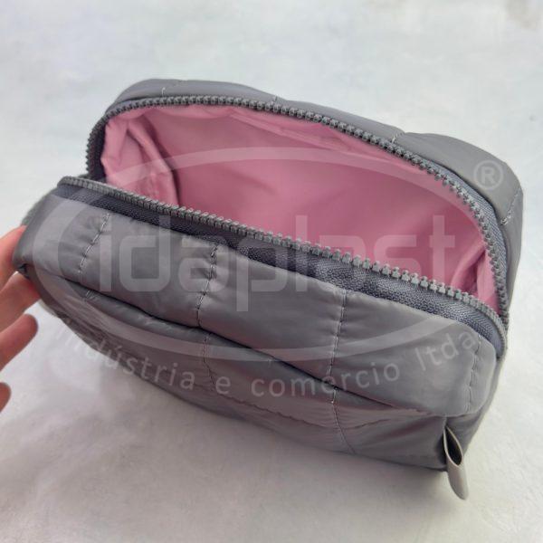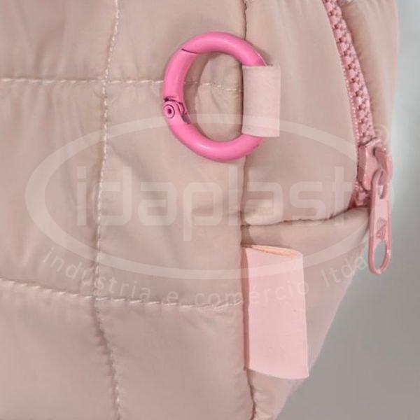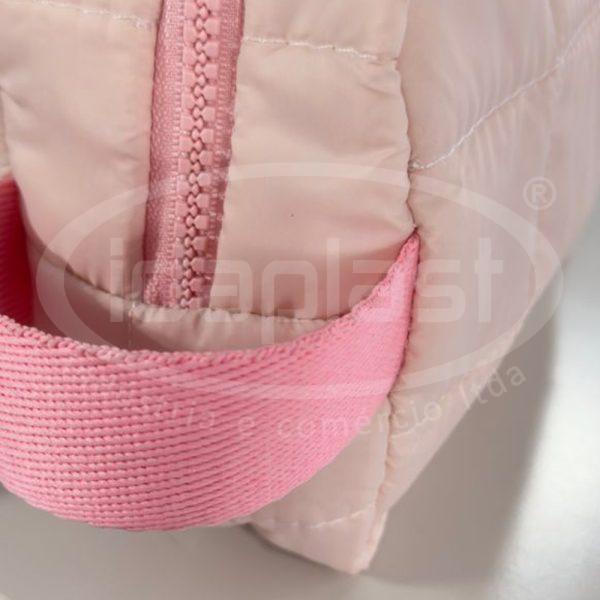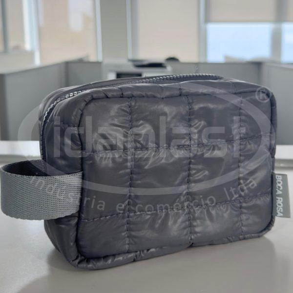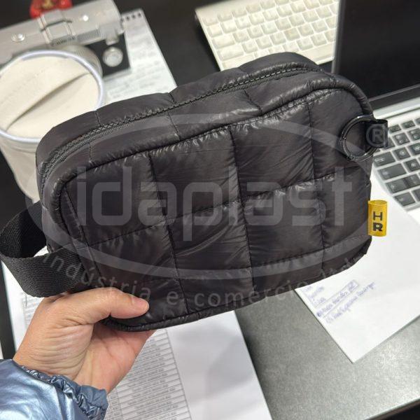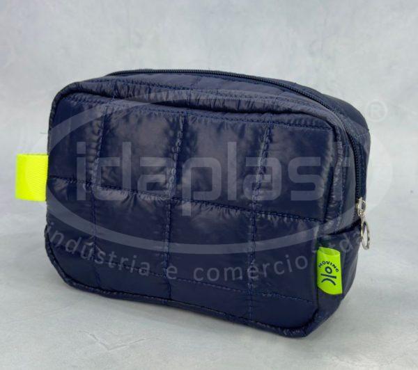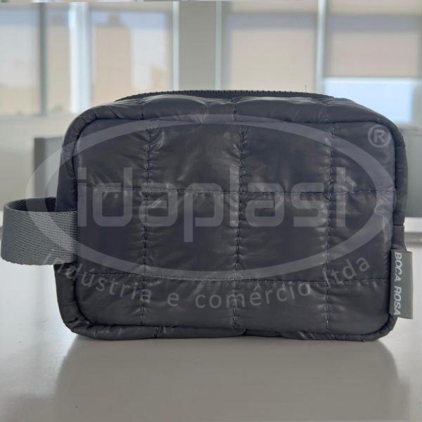 Necessaire puffer em formato quadrado com alça especial lateral, zíper trator ou comum e opcional de argola retrátil. Monte a sua com seu consultor!