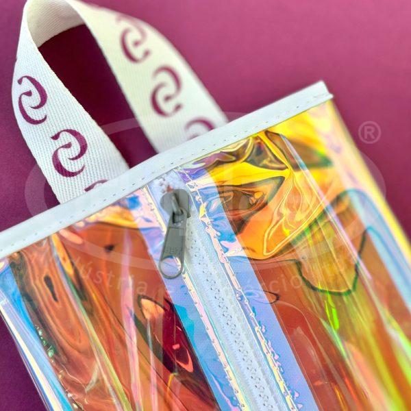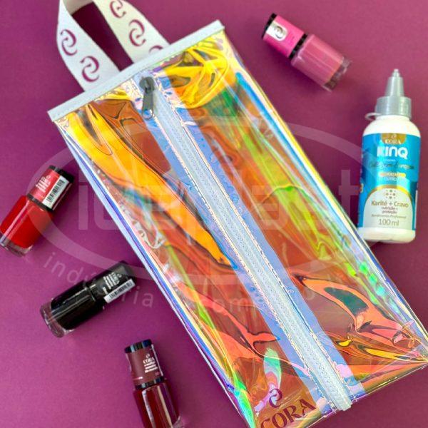 Frasqueira personalizada em PVC holográfico ou colorido, com opção de alça de mão personalizada. Monte a sua com nossos consultores :)