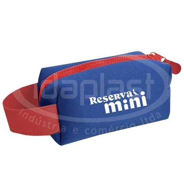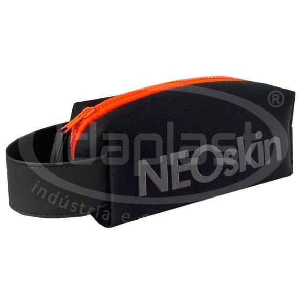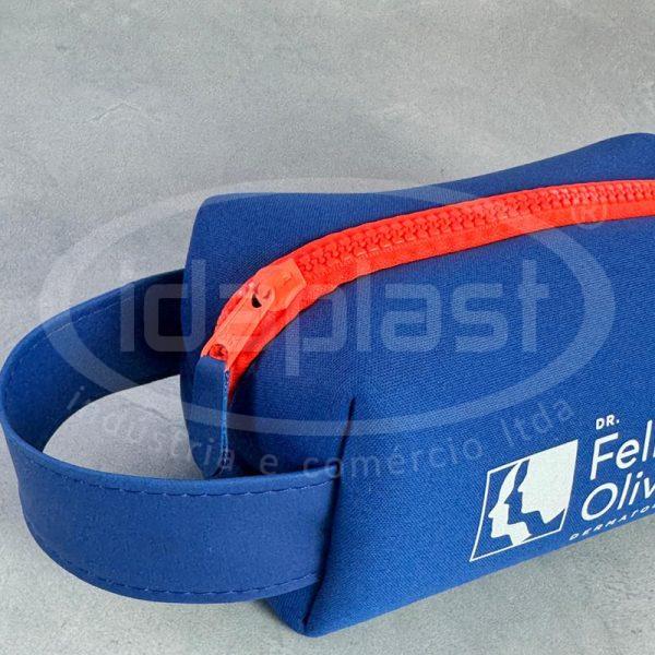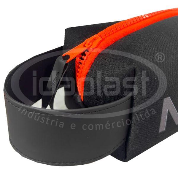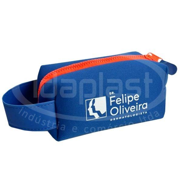 Frasqueira em neoprene com alça lateral, zíper comum ou trator e pegador para facilitar abertura da peça. Monte a sua com seu consultor!
