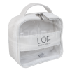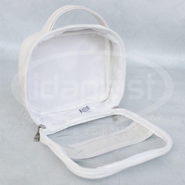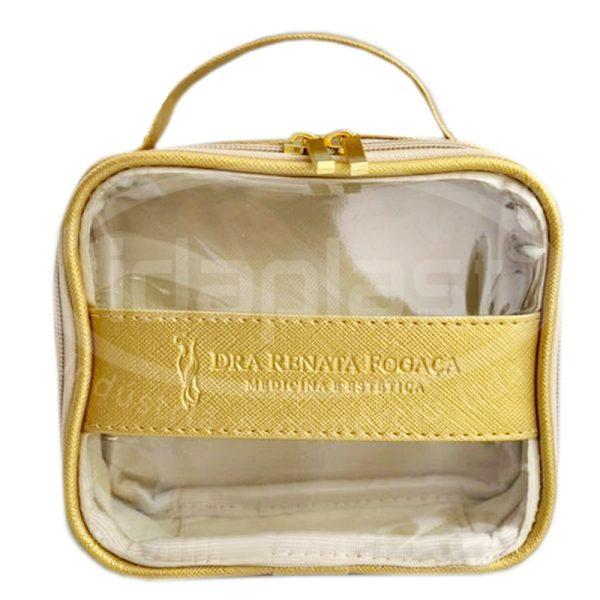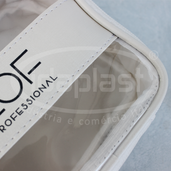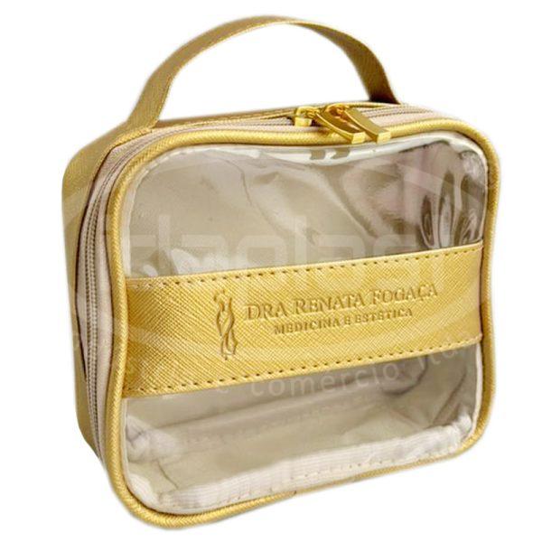 Necessaire personalizada fabricada em sintético (tipo e cor a definir). Com forro interno. Opcional de vivo encapado. Frente em PVC cristal com tarja vertical ou horizontal. Opcional de traseira em sintético ou PVC cristal. Com cursores comuns ou especiais. Monte a sua com a gente!