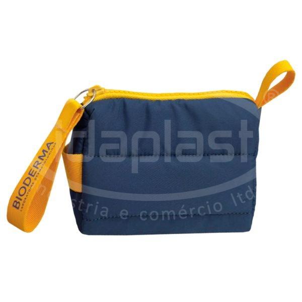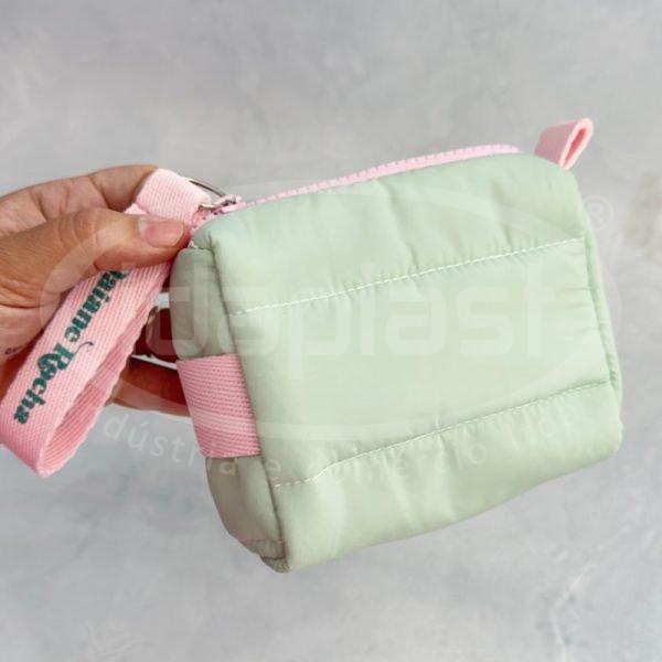 mini necessaire confeccionada em puffer (fofinho) com forro interno, zíper trator ou comum e alça na lateral. Detalhe para o puxador em correia especial, personalizada para abertura do zíper.