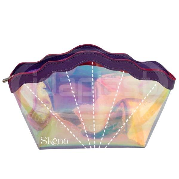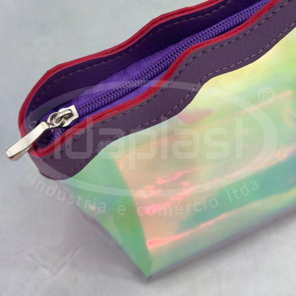 Necessaire em formato de concha. Pode ser confeccionada em diversos tipos de materiais: courino, poliéster, PVC cristal color ou PVC holográfico. Monte a sua com seu consultor!