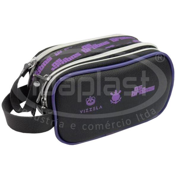 Necessaire em courino grosso, com interior de toque aveludado. Com 1 ou 2 compartimentos em zíper. Com estrutura em vivo e alça lateral.