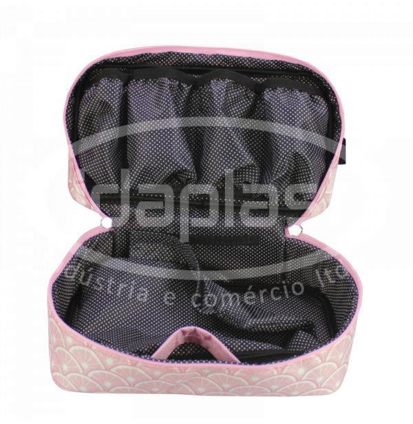 Necessaire personalizada em poliéster ou courino sintético. Sugestão de confecção na parte interna com bolsos para calcinhas e meias e suporte sequencial para sutiãs. Além disso, pode acompanhar necessaire interna removível. Consulte a possibilidade de personalização via impressão digital.
