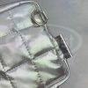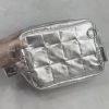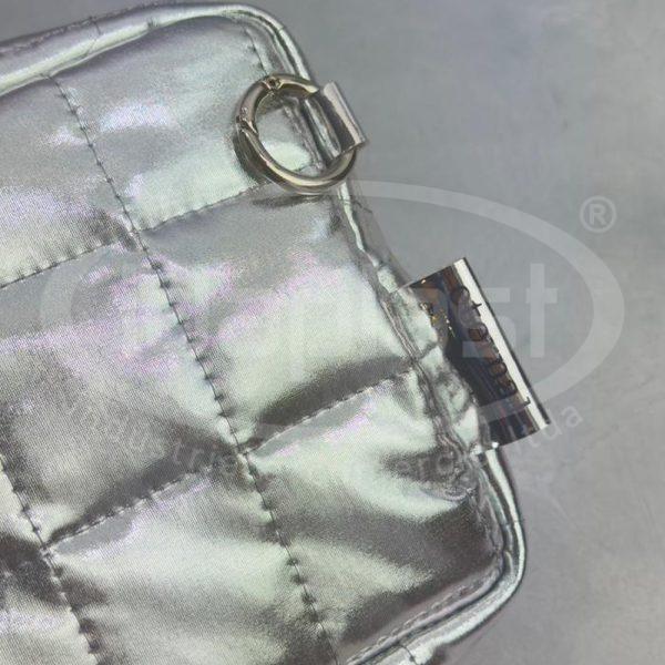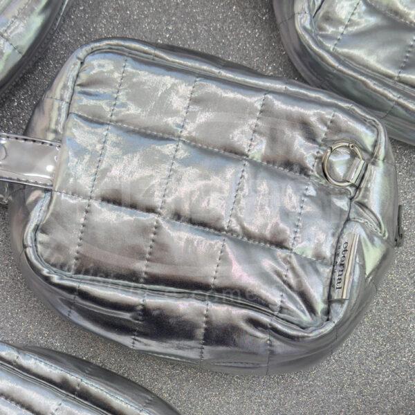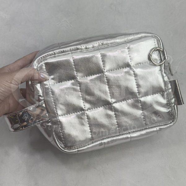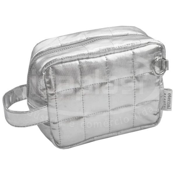 Necessaire puffer metalizada em puffer quadriculado simples ou metalizado. Com zíper comum ou trator, alça e tag em sintético espelhado. Com opcional de argola retrátil.
